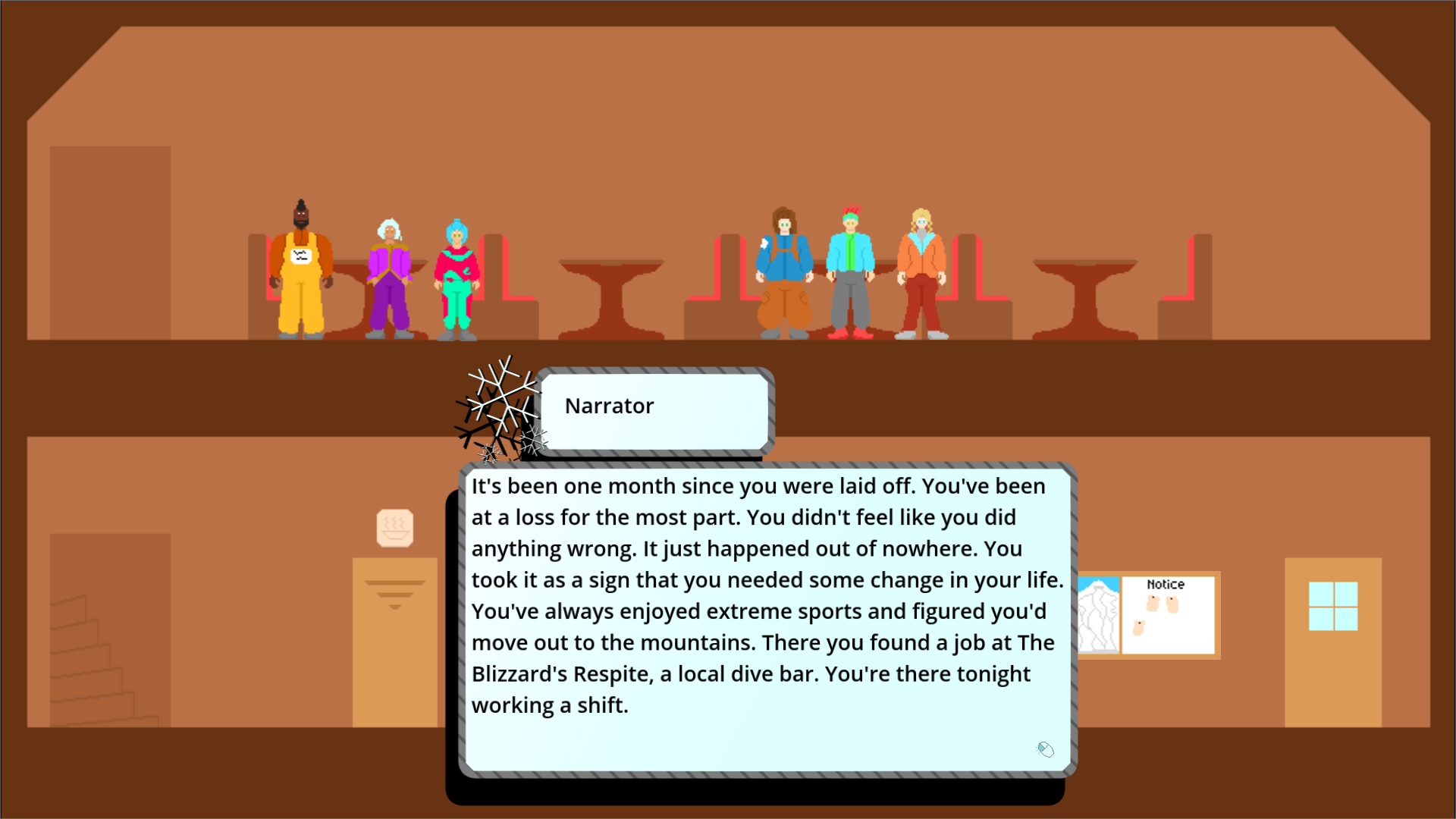 This story starts as so many do. Four people met in a bar. You play as either Joseph or Alice. You were recently laid off after only a year out of college and you’re wandering right now. Bouncing between jobs you landed as a bartender in a ski town where you met the teams. None of you know each other, but you all need a change. Make a choice between which team you’ll join. You’re in a lull waiting for something to happen and this might just be your chance to make it big.